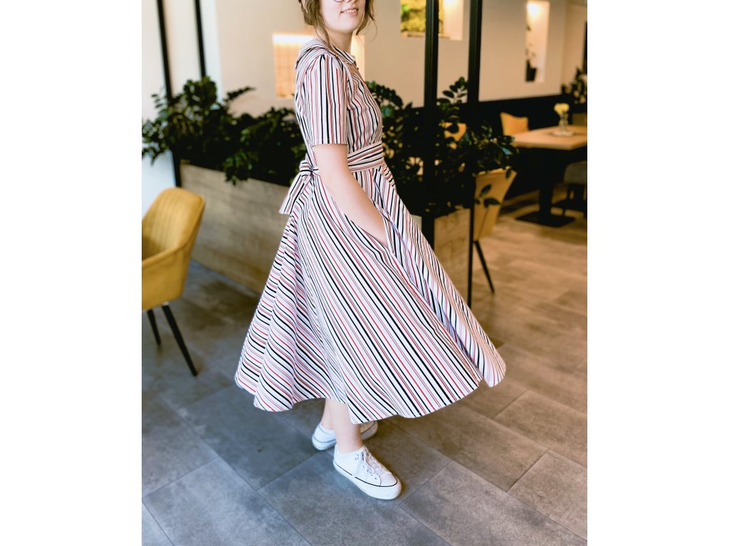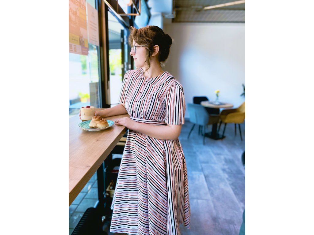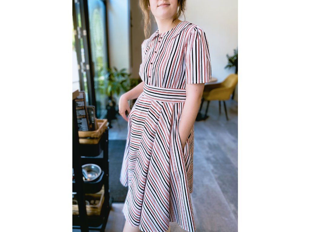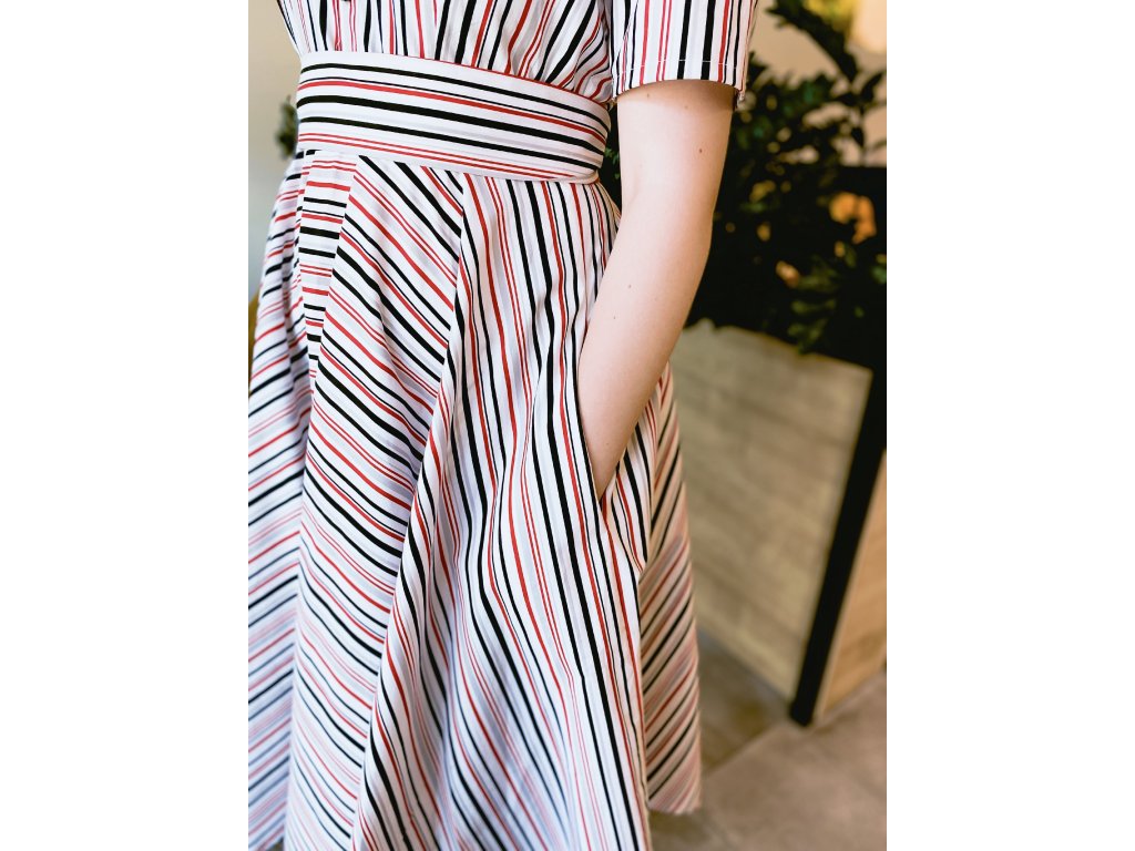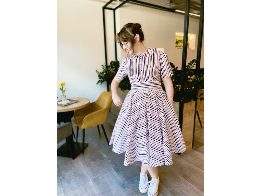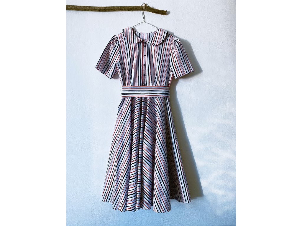Ušité z pruhovanej veľmi príjemnej bavlny, ktorá krásne drží tvar rukávov a ačkovej línie sukne.