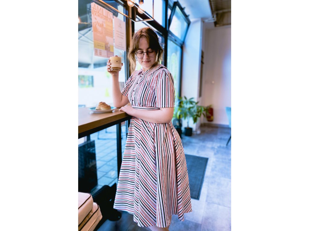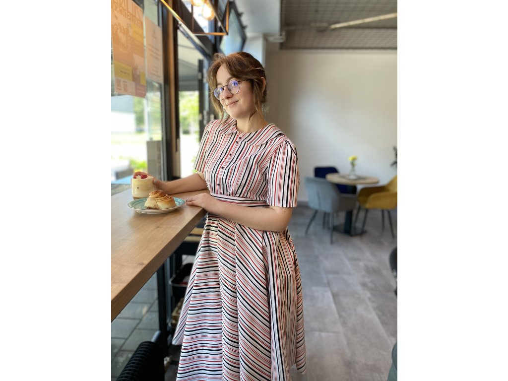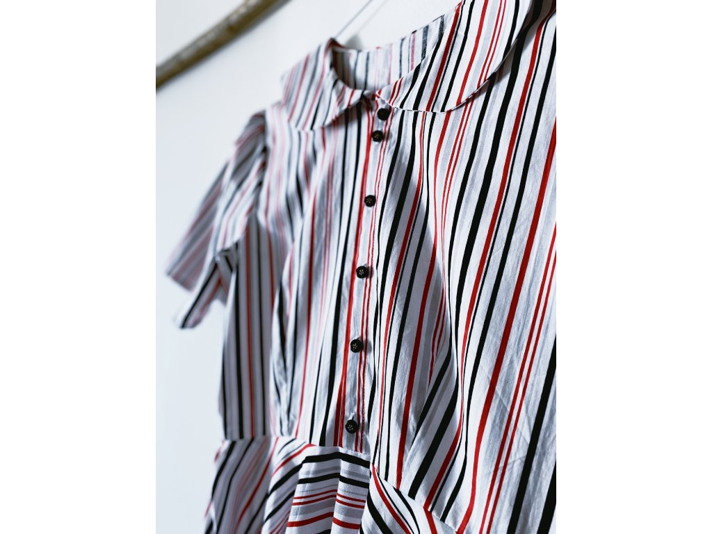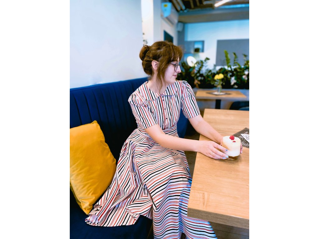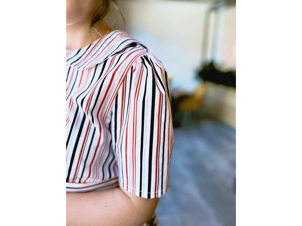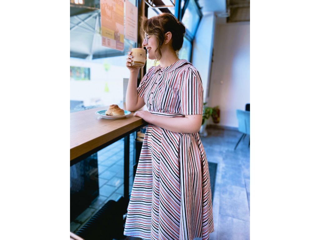Ušité z pruhovanej veľmi príjemnej bavlny, ktorá krásne drží tvar rukávov a ačkovej línie sukne.